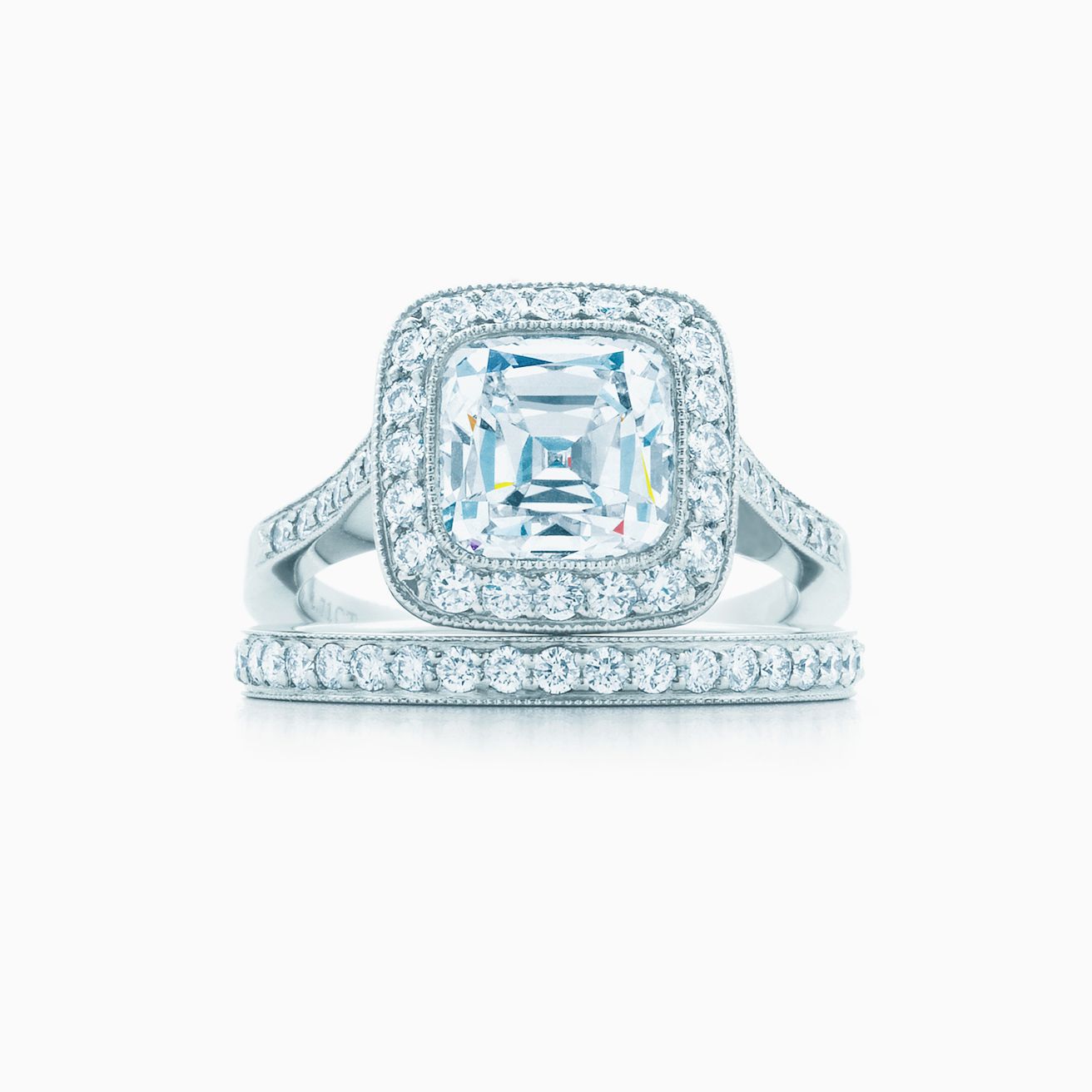 Tiffany Legacy® engagement ring with a diamond band in platinum. Tiffany & Co.
